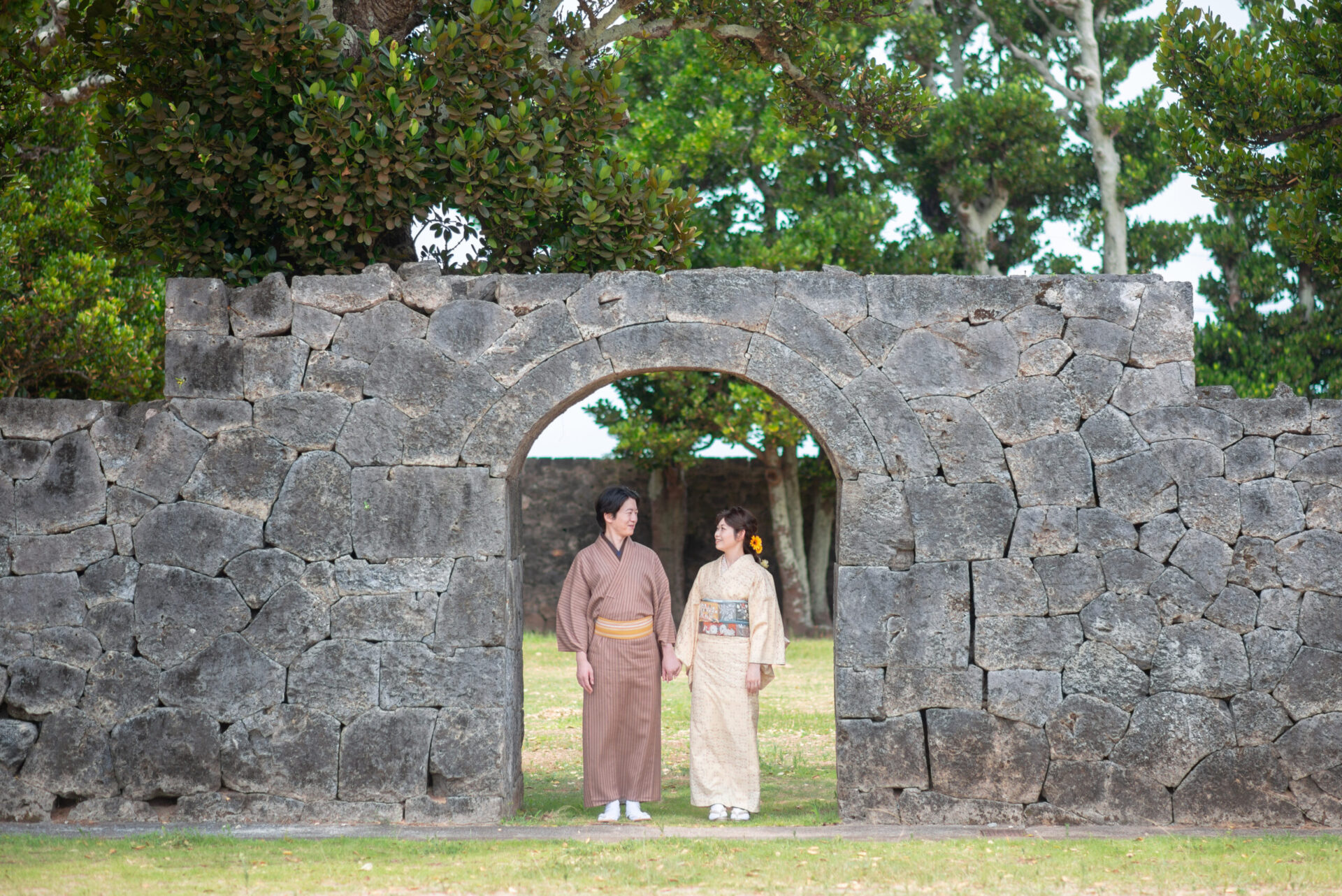 前撮りでは新婦さんが久米島在住経験があることから、お気に入りのスポットでの撮影や久米島を代表する絹織物・久米島紬のお着物お召しになって撮影しました。時期は真夏の7月中旬。お天気はあいにくの曇り空でしたが、汗だくになりながらも(笑)楽しく島内を巡り、久米島でしか出来ない特別な前撮りとなりました。