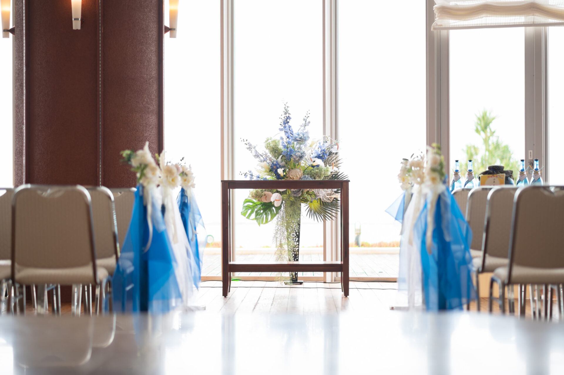 結婚式は9月中旬に執り行うことに。会場は久米島のホテル「サイプレスリゾート 久米島」さんにて。海がお好きな新婦さんのイメージに合わせてブルーを基調とした会場装飾やゲストも参加して楽しめるセレモニーとなるよう意識。