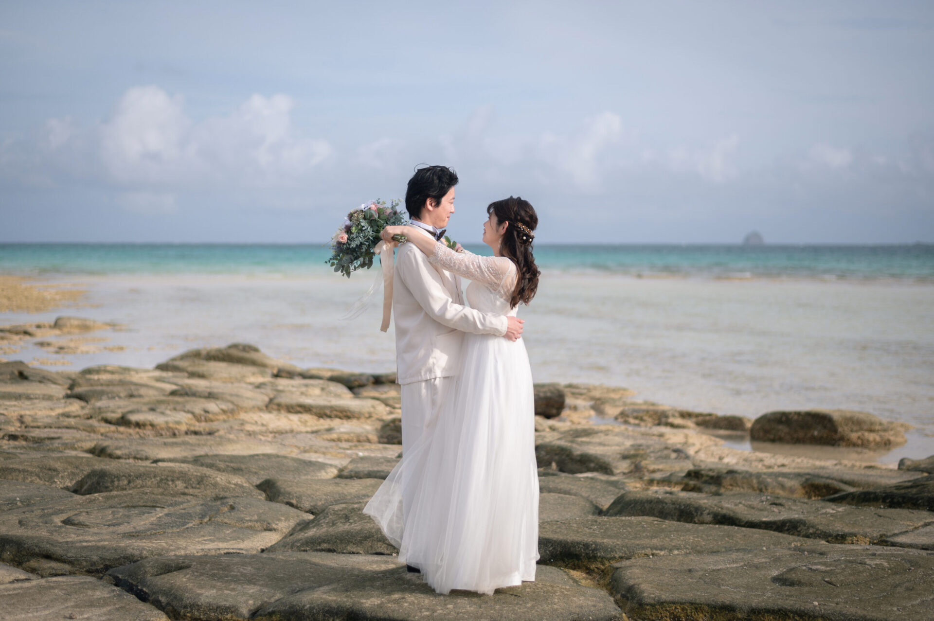 ご相談頂いたのは、2021年の夏のこと。もともとご旅行や食べるこが大好きなおふたり。当初はご両親も一緒にヨーロッパをご旅行しながらウェディングがしたいと計画されていたそう。しかしコロナ禍で色々なハードルがあり泣く泣く断念。そこで、以前新婦さんがお仕事の関係で久米島に住んでいた経験があり、大好きな離島ということから「ぜひ久米島で前撮りとアットホームなウェディングがしたい」とご依頼いただきました。